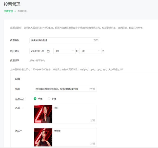 4、微信公众号发起投票中的图片像素为300*300,大小不超过1M。
