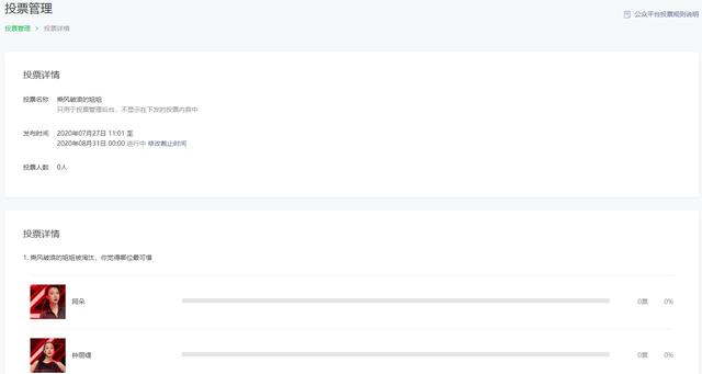5、微信公众号发起投票具体的投票情况,可以在投票管理,查看对应投票标题详情中查看,可以看到投票人数、投票占比等情况,也可以修改投票时间。